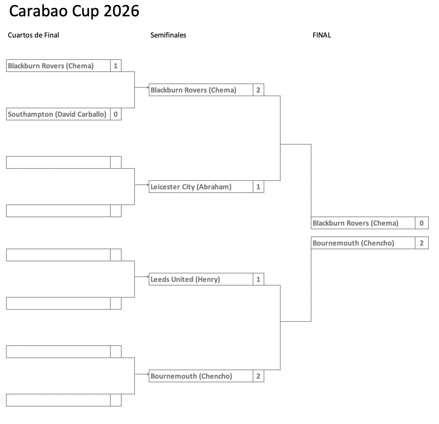 FA y Carabao Cup 2026 Fase Liga FA Cup Carabao Cup Carabao Cup Finalistas Compártelo: Compartir en X (Se abre en una ventana nueva) X Comparte en Facebook (Se abre en una ventana nueva) Facebook Compartir en WhatsApp (Se abre en una ventana nueva) WhatsApp Imprimir (Se abre en una ventana nueva) Imprimir